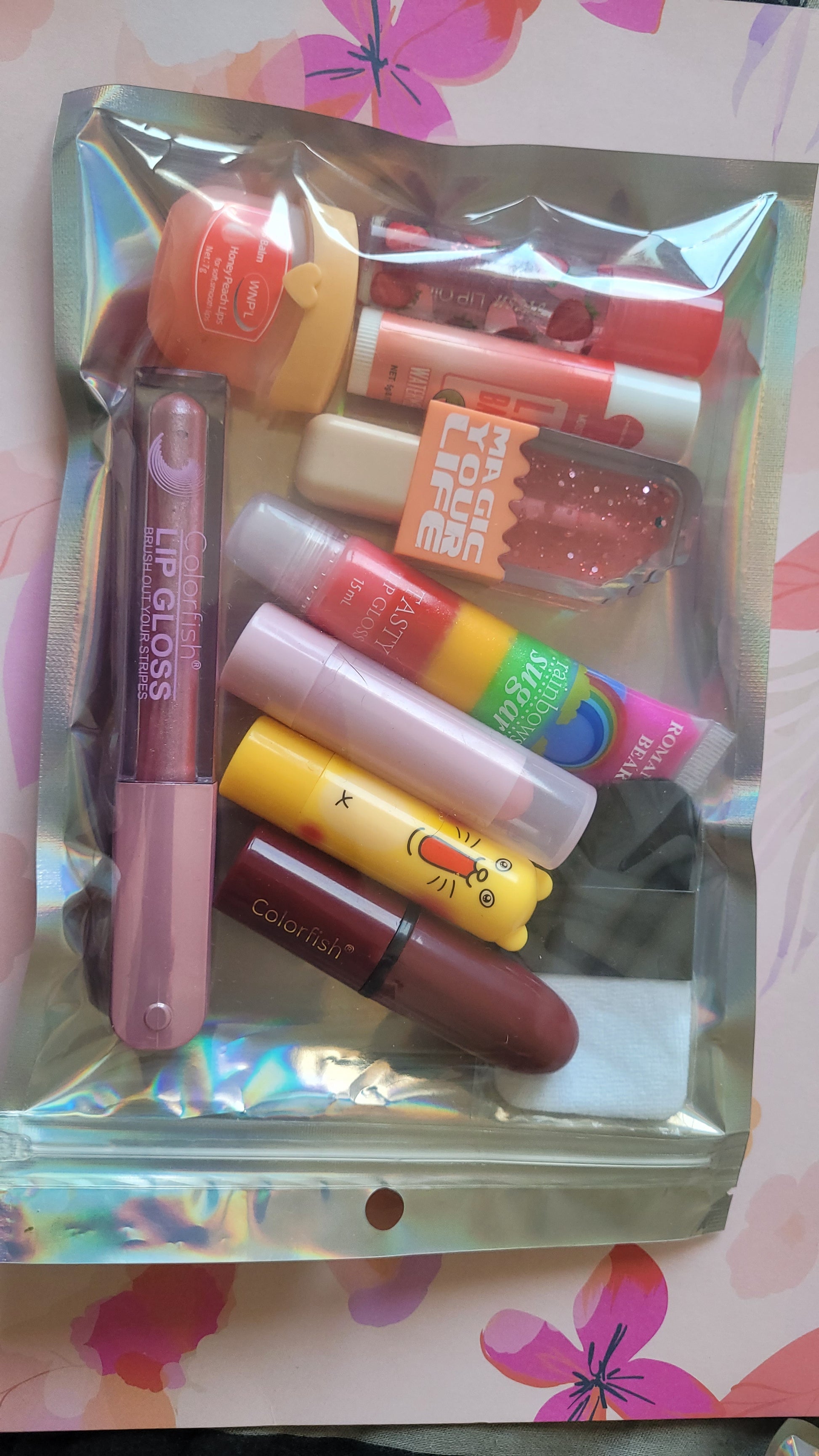 Un roller fraise/baume melon/gloss pailletté glace/baume tigre/ lip gloss Rainbows/baume rose/rouge à lèvre/un pinceau blush Ysl/vasseline lèvre et un gloss rose💄(box 55)