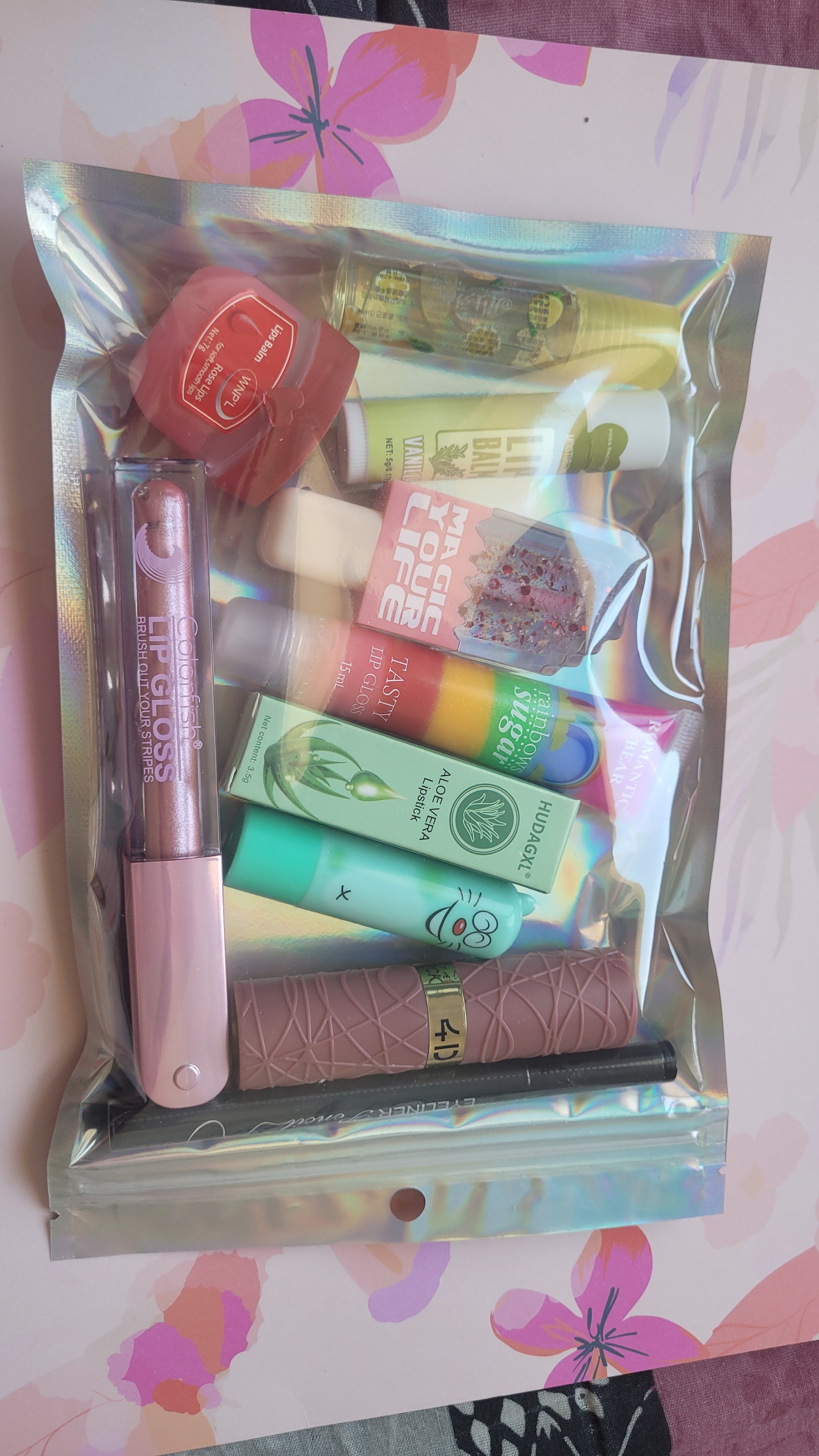 Un roller citron/baume vanille/gloss pailletté glace/baume chat/ lip gloss Rainbows/baume aloe vera/un rouge à lèvre/un eyeliner/vasseline lèvre et un gloss rose💄(box 51)
