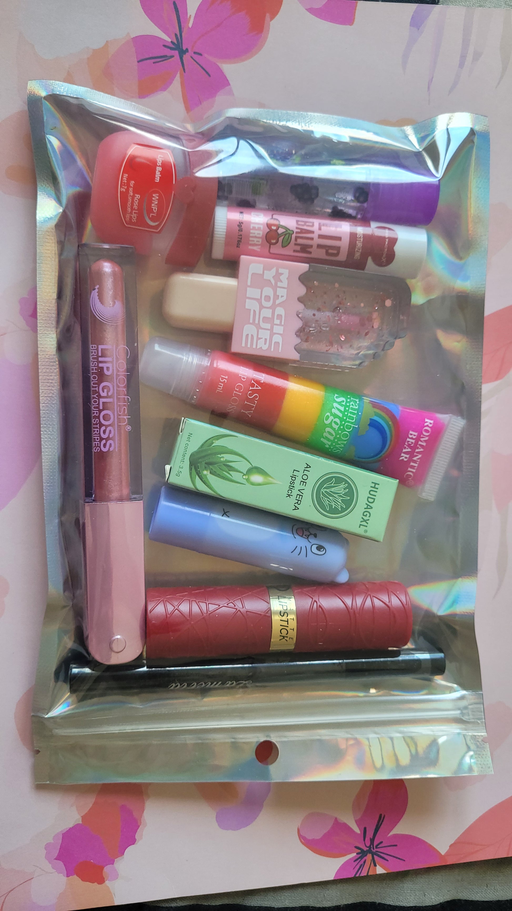 Un roller mure/baume cerise/gloss pailletté glace/baume animal/ lip gloss Rainbows/baume aloe vera/rouge à lèvre lipstick/un eyeliner/vasseline lèvre et un gloss rose💄(box 56)