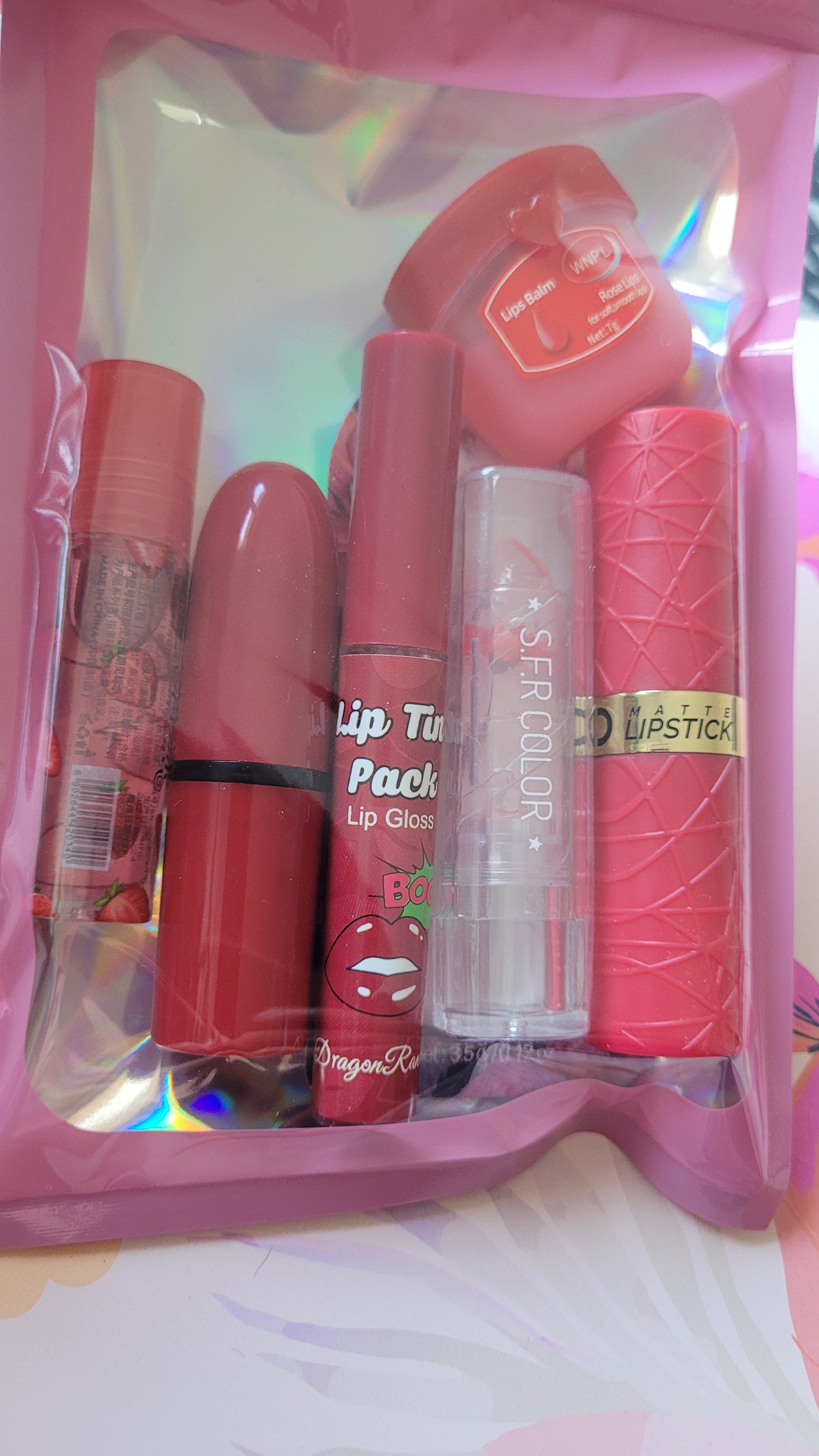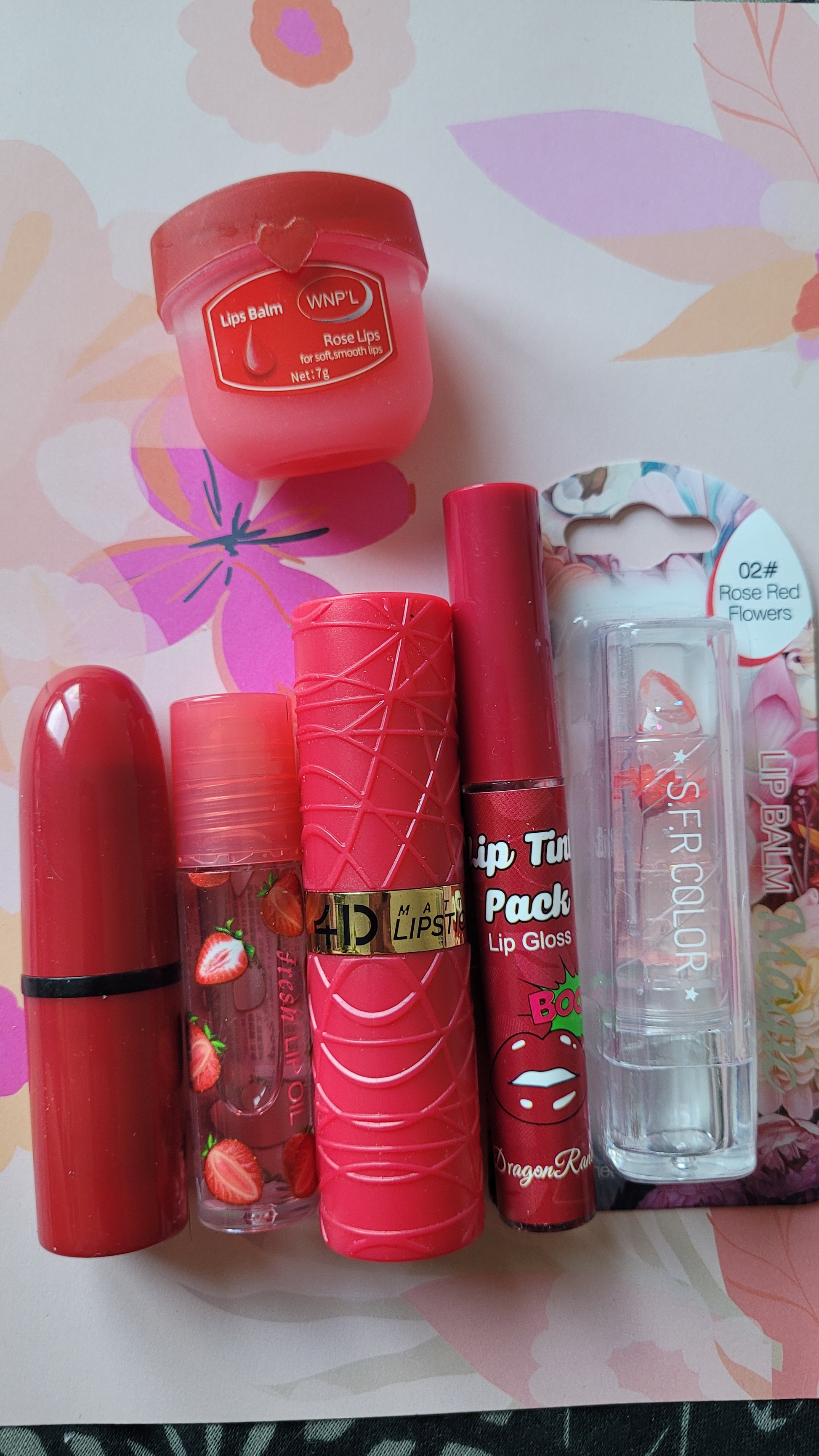 2 rouges à lèvre, un lip gloss, un roller fraise, un rouge à lèvre color fleur et une vasseline lèvre.💄(box60)