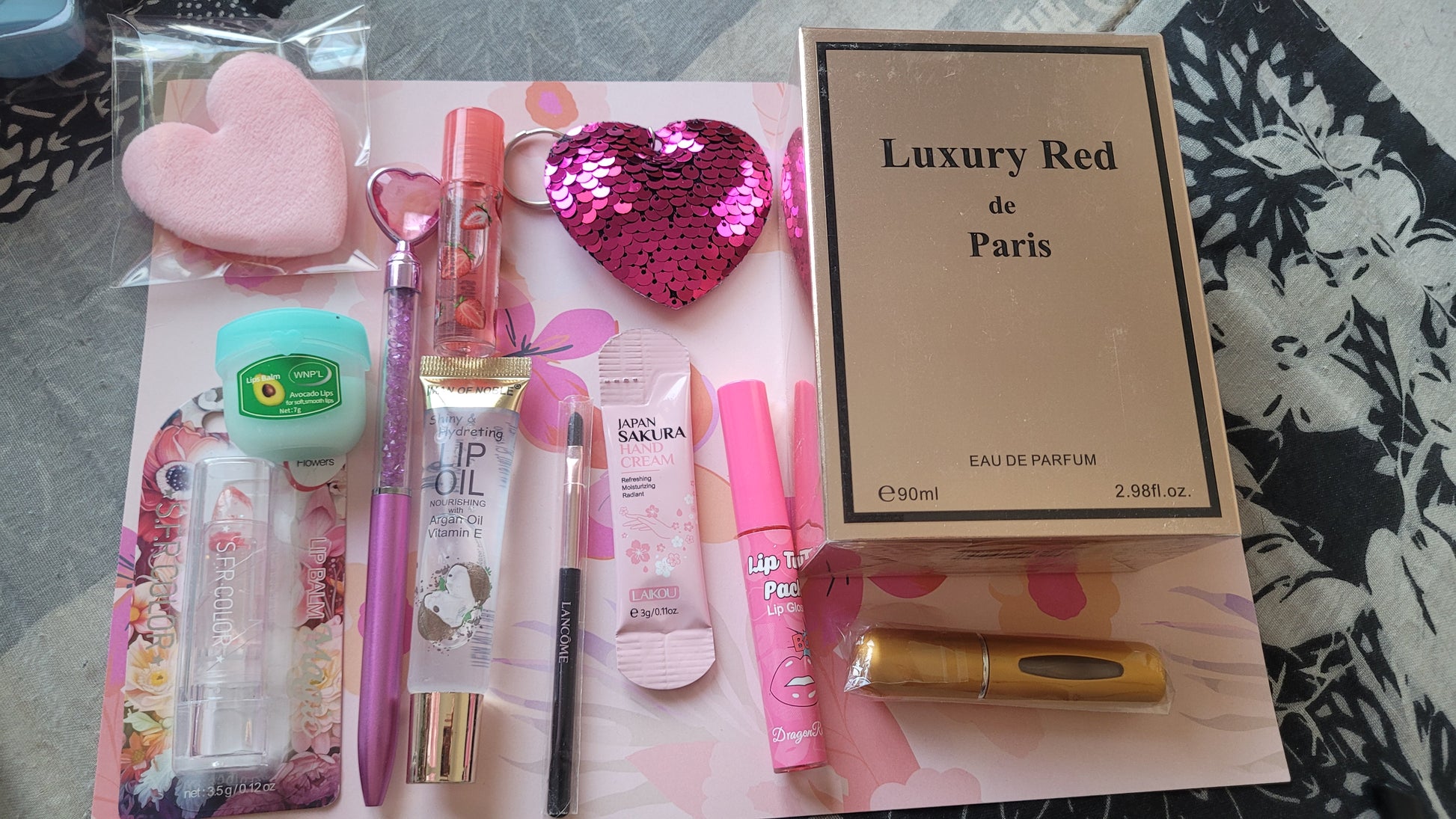 Un parfum dupe, une regarge parfum, un lip oil coco, un rouge à lèvre color fleur, un lip gloss, un roller fraise, un baume avocat, une crème main, un pinceau lèvre lancome, un stylo violet, un porte clés coeur fushia et coeur rose éponge.🌺
