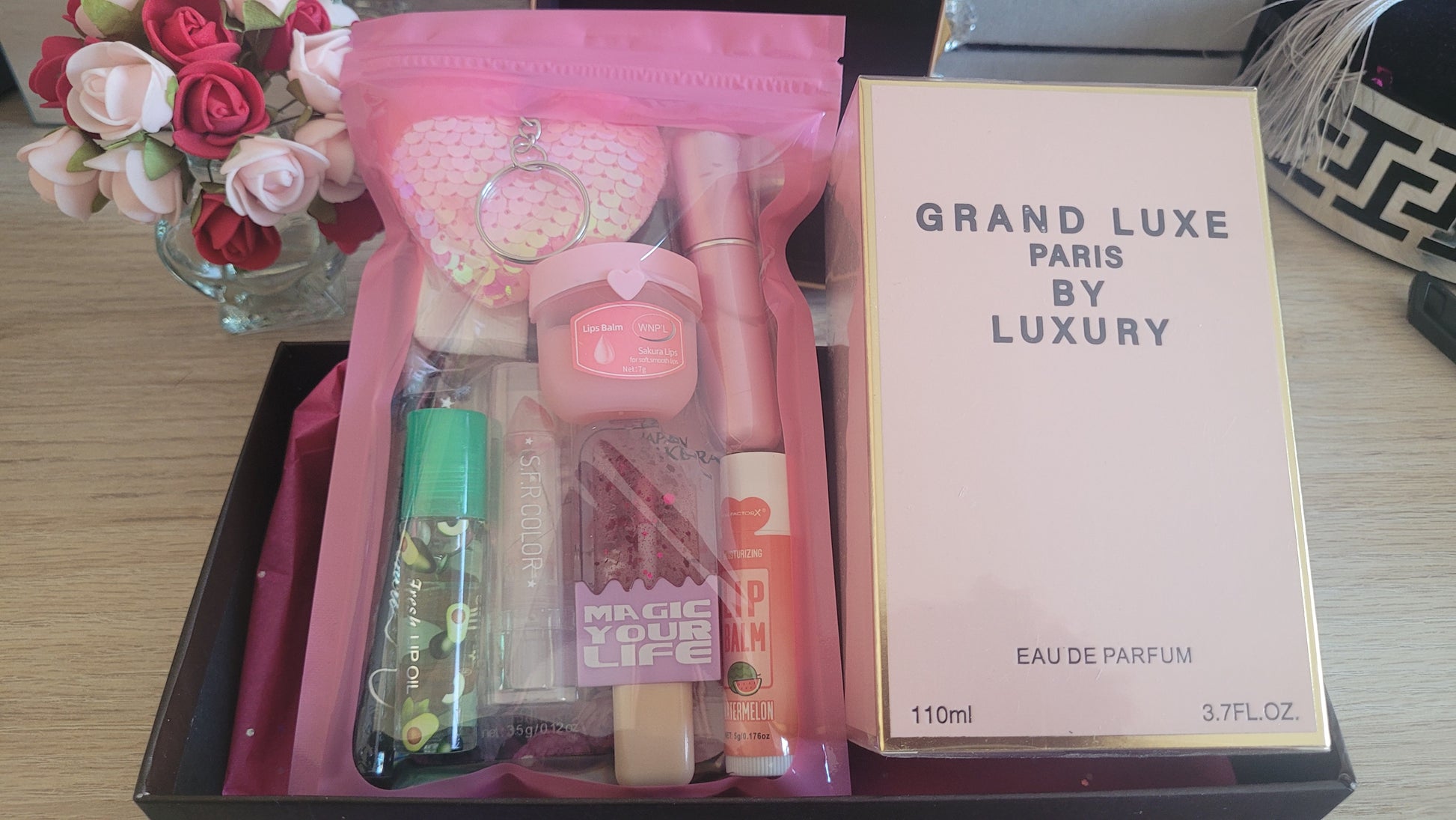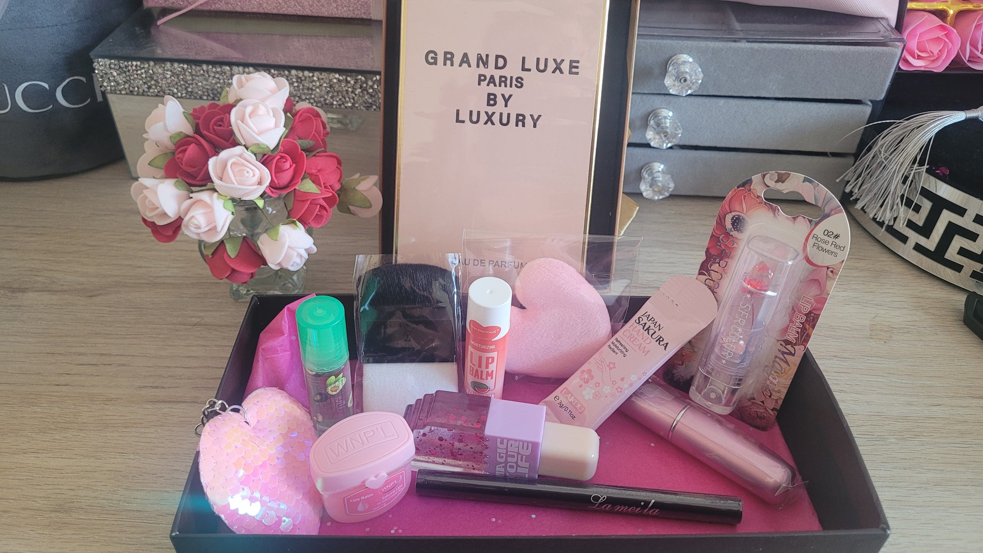 un parfum dupe, une huile, un rouge à lèvre, un gloss, un lip gloss, un baume, une crème main, un eyeliner, une recharge parfum violette, un porte clés coeur, un pinceau YSL et coeur rose éponge.🌺