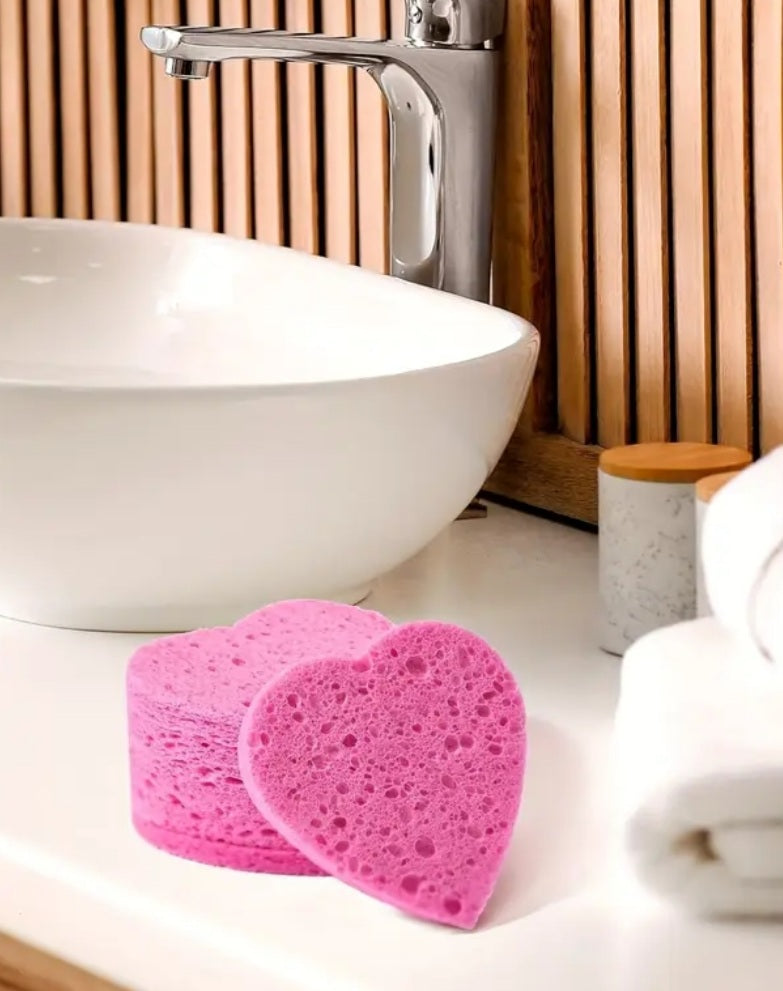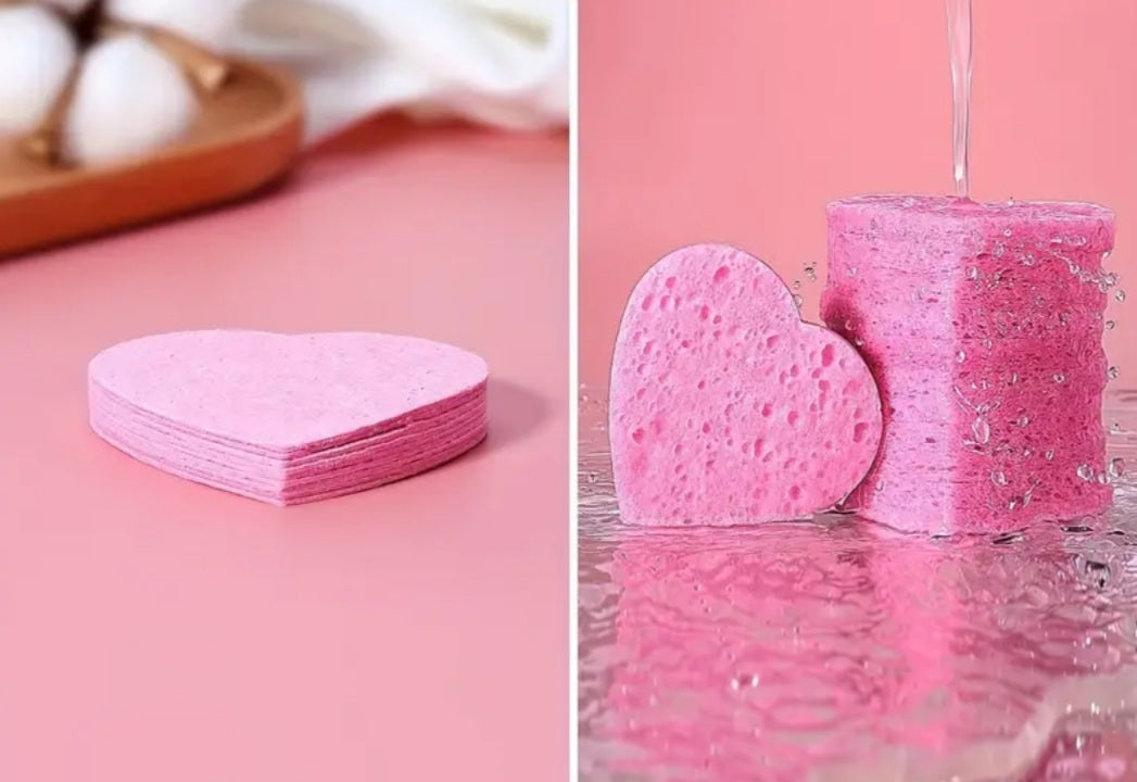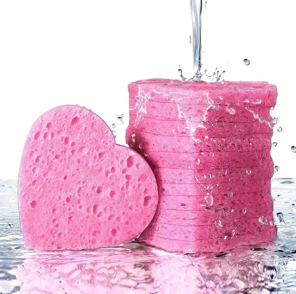 éponge pour le visage nettoyante. Petite éponge rose en cœur qui gonfle dans l'eau.
