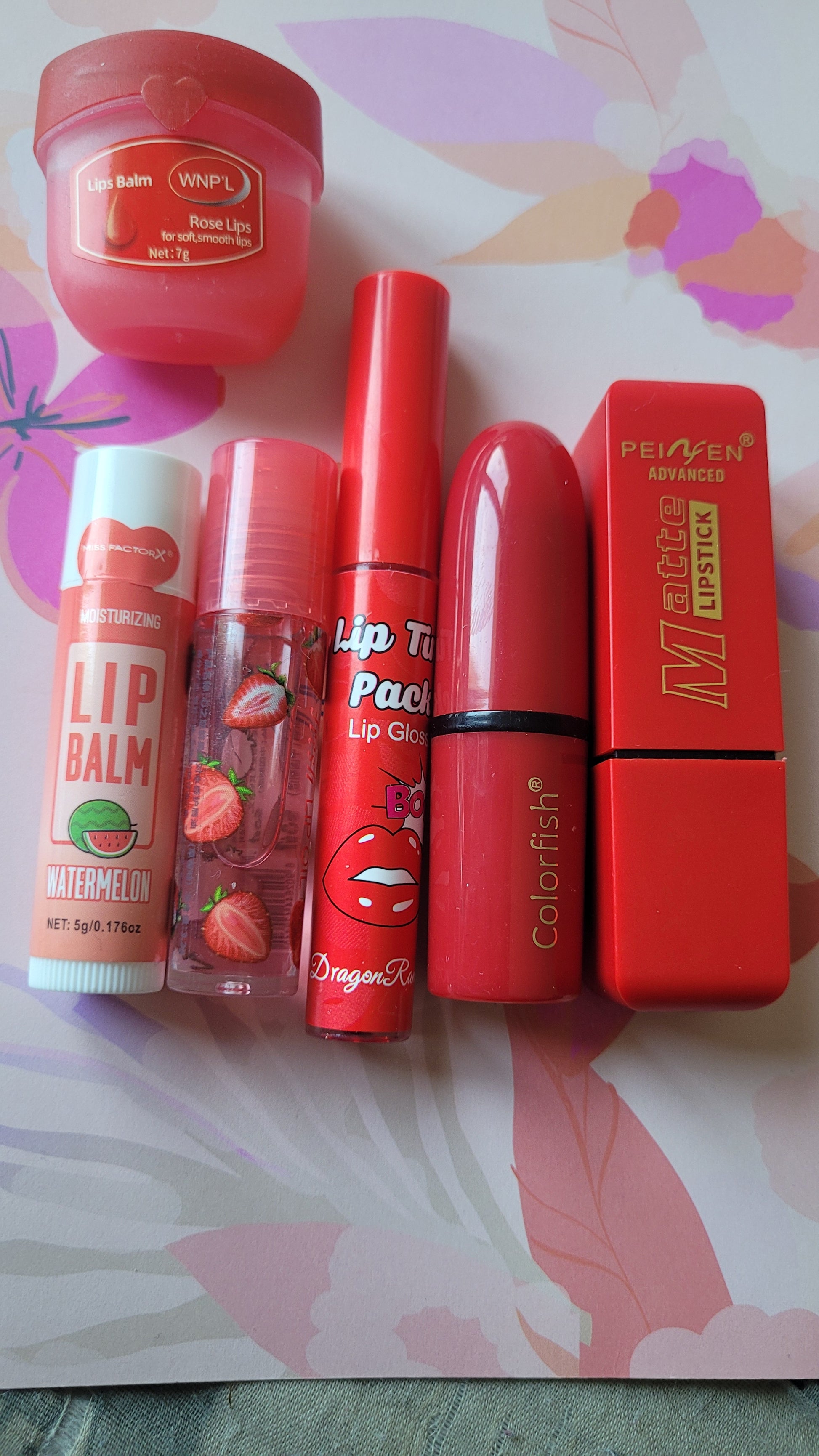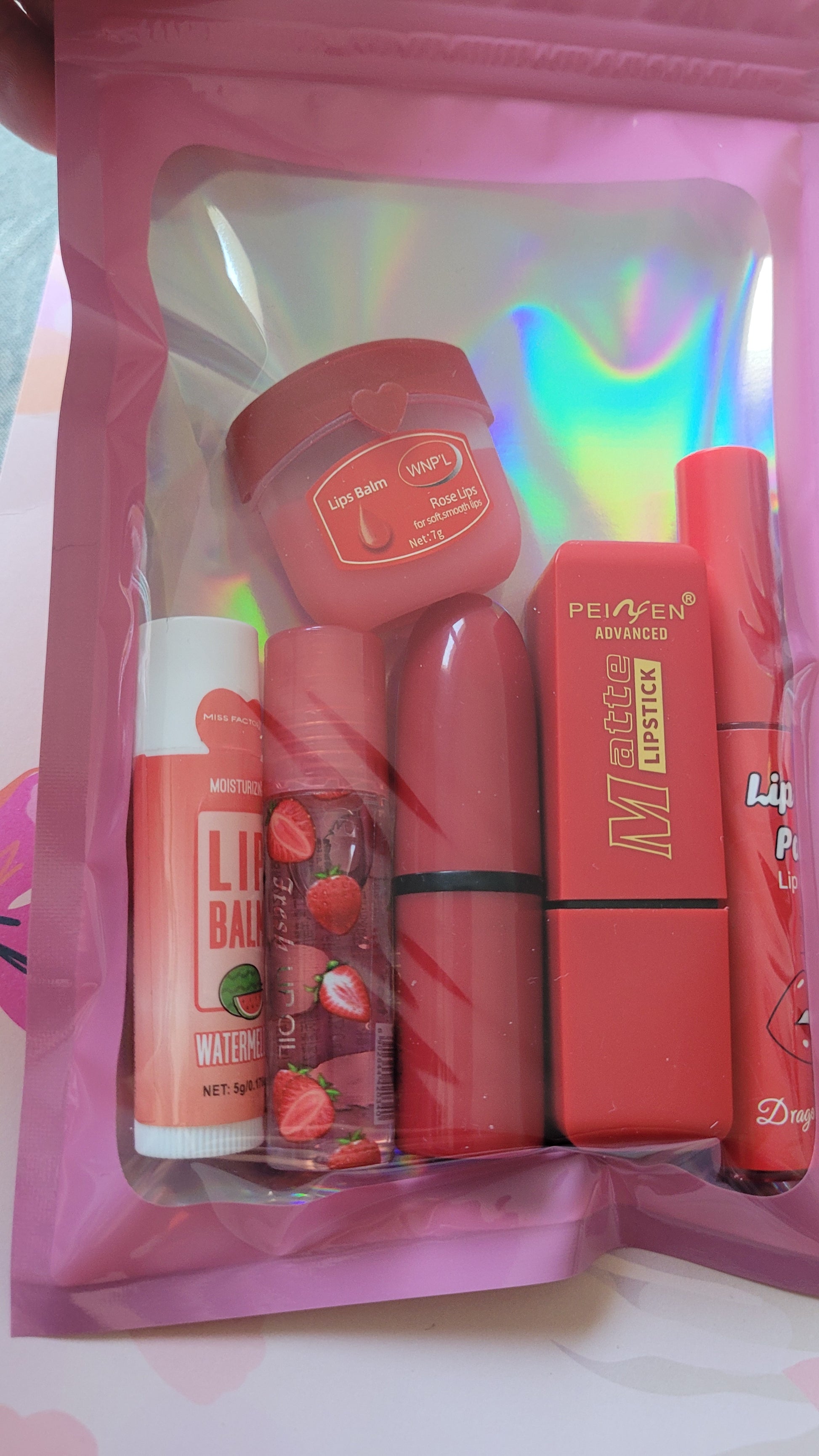 2 rouges à lèvre, un lip gloss, un roller fraise, un baume pastèque et une vasseline lèvre.💄(box59)