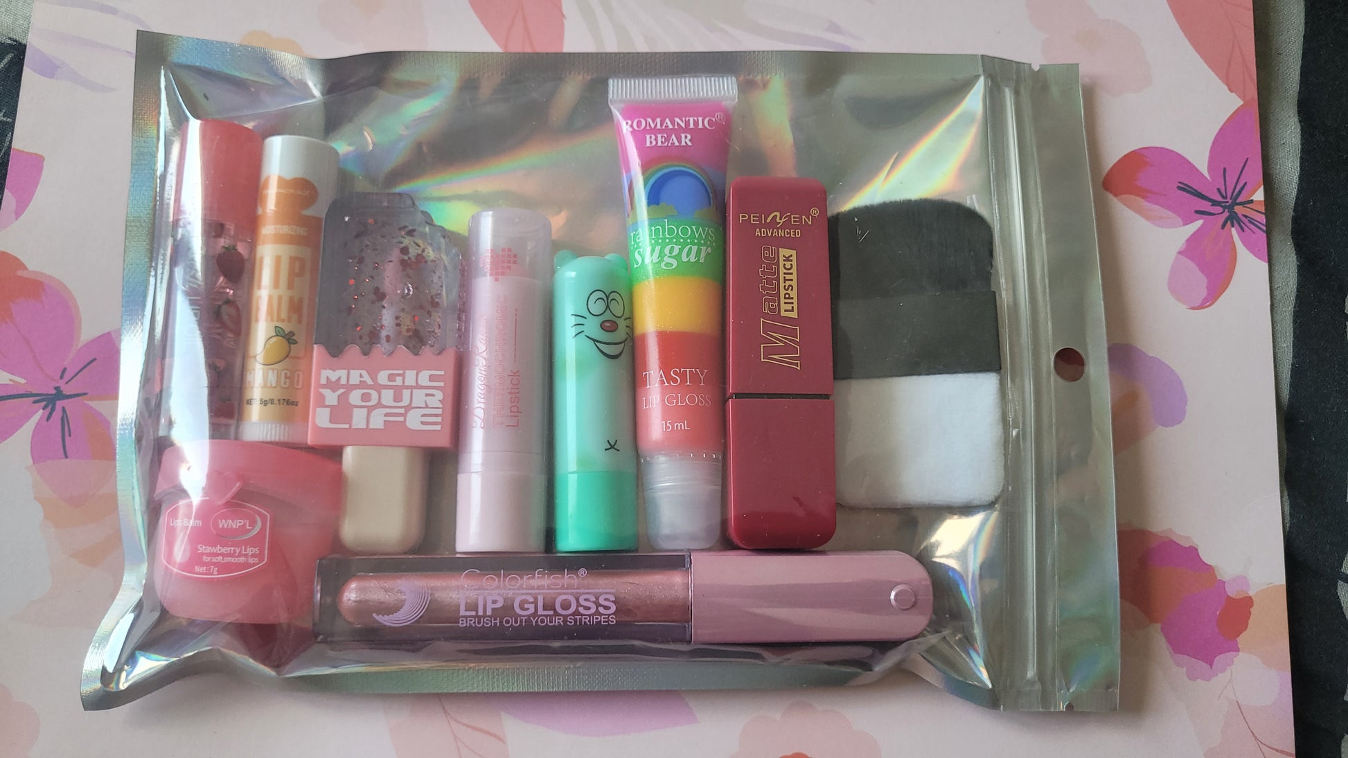 Un roller fraise/baume mangue/gloss pailletté glace/baume animal/ lip gloss Rainbows/baume rose/rouge à lèvre lipstick/un pinceau blush Ysl/vasseline lèvre et un gloss rose💄(box 54)