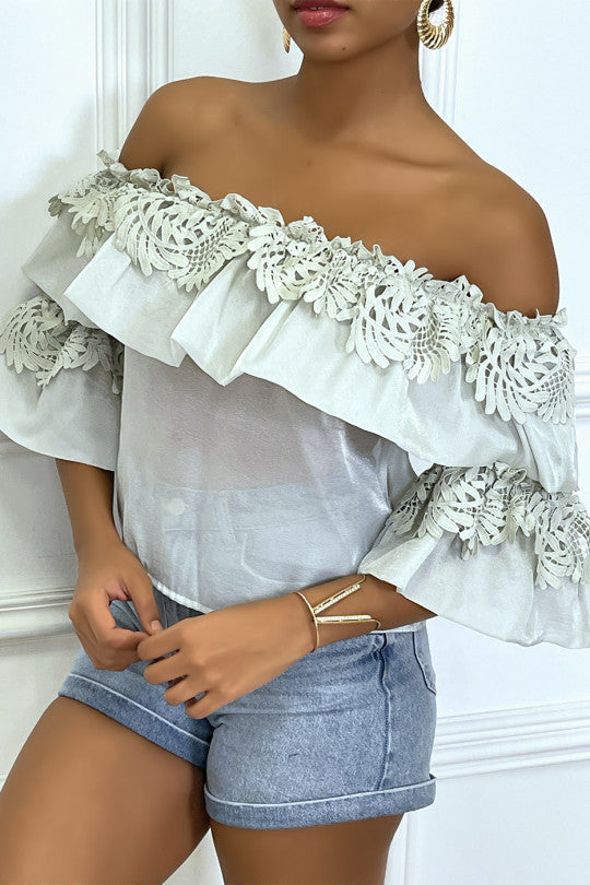 Top bardot vert d'eau à volants et motifs ajourés en relief